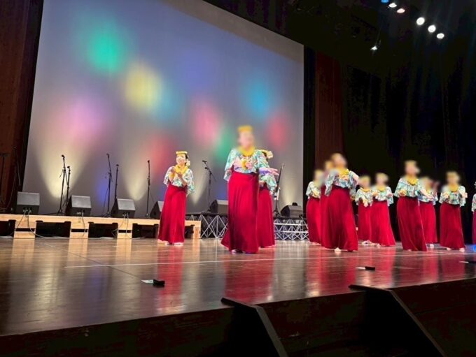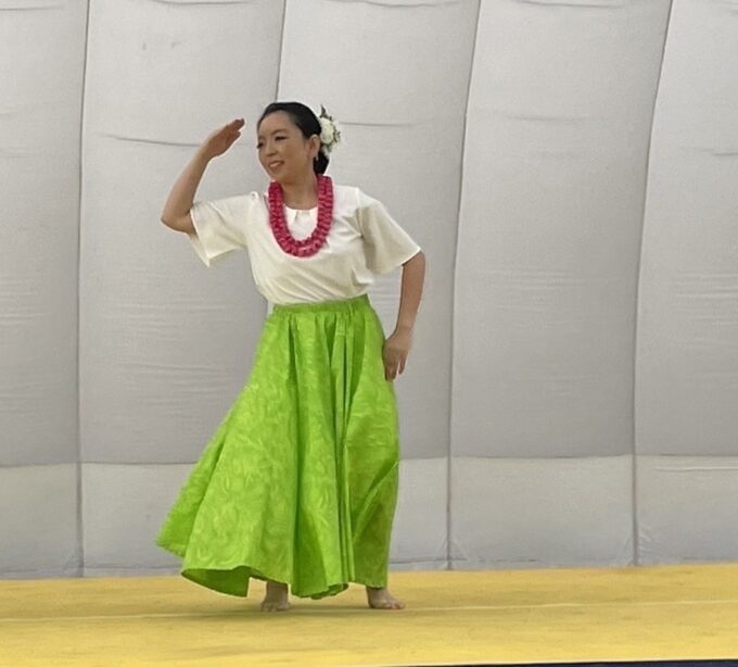 フラダンス仲間とステージで踊る長澤さん(一番左)