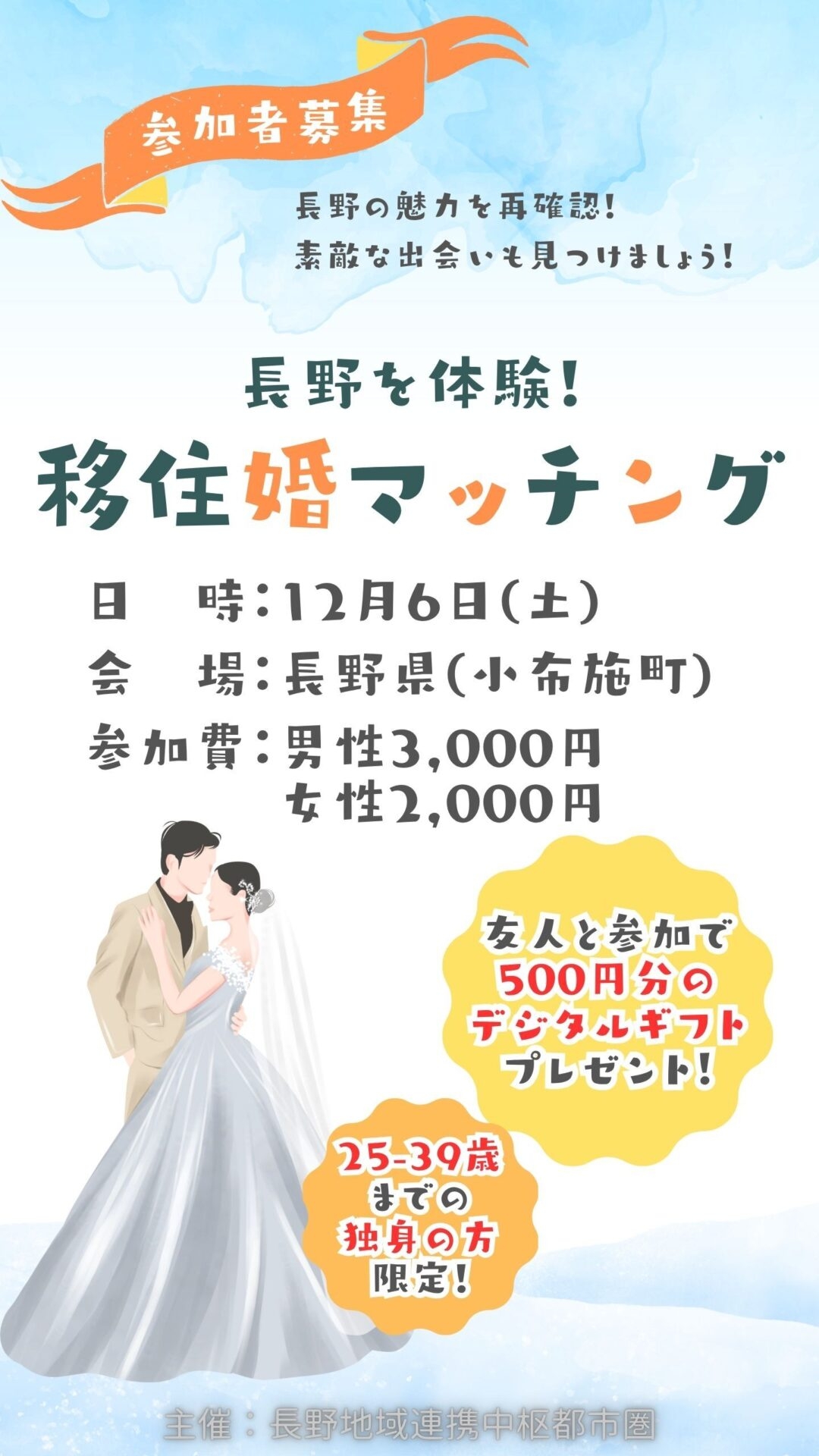 | 参加対象者 | ◆女性 ・長野地域在住の25歳~39歳の独身者 ・長野県外在住で長野地域への移住に興味がある25歳~39歳の独身者 ◆男性 ・長野地域在住の25歳~39歳の独身者 ☆ご友人と参加で特典(ギフトカード500円分!) ※長野地域:長野市、須坂市、千曲市、坂城町、小布施町、高山村、信濃町、小川村、飯綱町 |