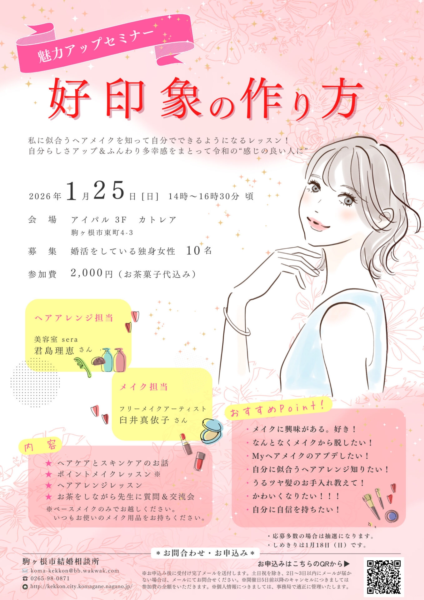 | お問い合せ先 | 駒ヶ根市結婚相談所 TEL 0265-98-0871(平日10:00~17:00) |