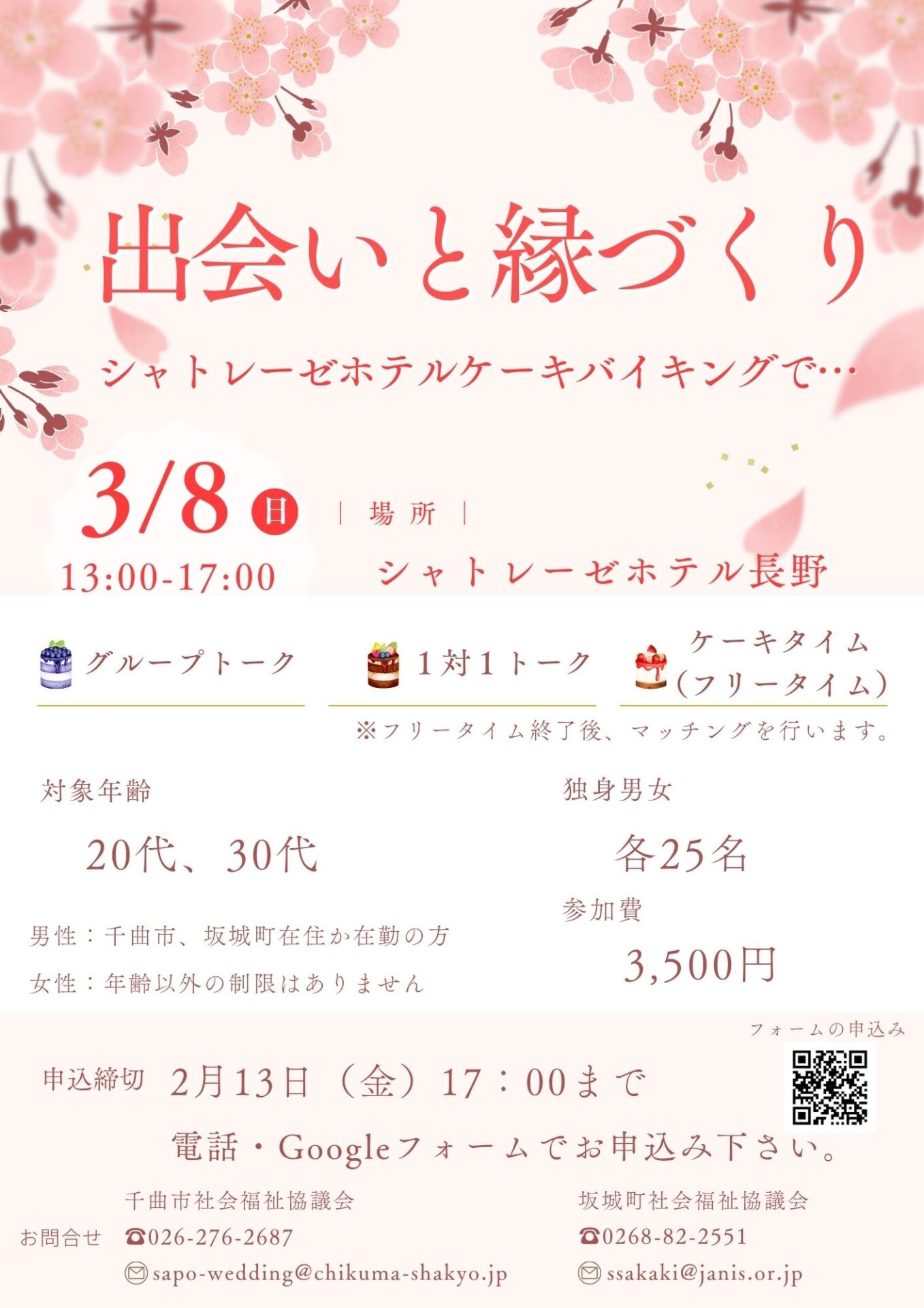 | 参加対象者 | 20代、30代の独身男女 男性:千曲市・坂城町に在住か在勤の方 女性:年齢以外の制限はありません |