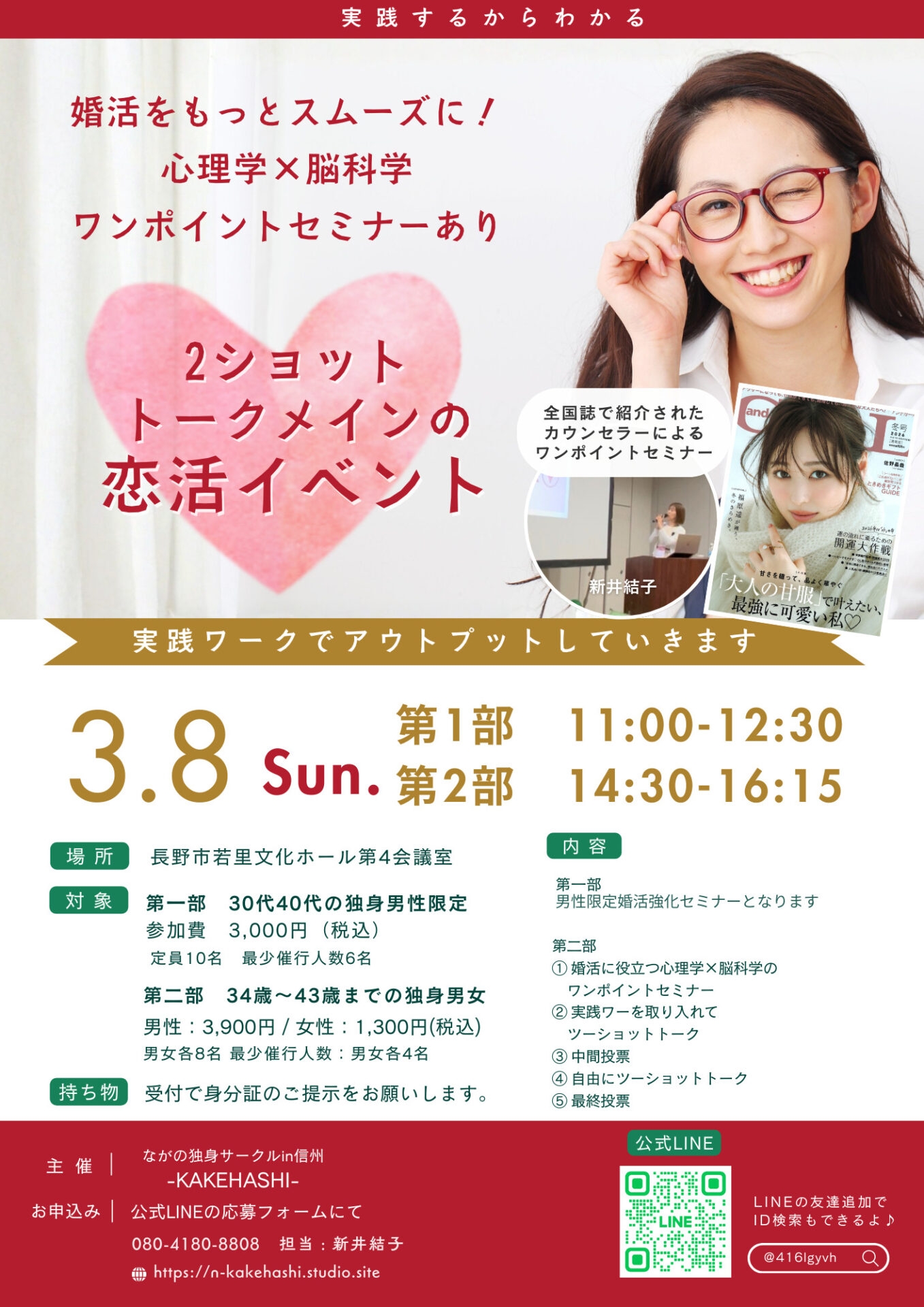 | 開催日時 | 2026年3月8日(日) 第1部 11:00〜12:45 第2部 14:30〜16:15 当日の流れ 【第1部 11:00〜12:30 】 「男性限定婚活強化セミナー」 対象:30代40代の独身男性 定員10名 最少開催人数6名 第一部は内容変更のため参加費 3,900円→ 3,000円となります。 【第2部 14:30〜16:15】 「ツーショットトークとワーク体験恋活イベント」 対象:34〜43歳の独身男女 定員男女各8名 最少開催人数男女各4名 ーーーーーーーーーーーーーーー 第1部「男性限定婚活強化セミナー」 11:00〜12:30 10:30 受付開始 11:00 開始挨拶・自己紹介 11:15 強化セミナー 【予定内容】 ・婚活がなぜうまくいかないのか? ・“自分に合う女性”を見つける具体的な視点 ・選ばれる男性が無意識にやっていること ・申し込みや会話がスムーズになる考え方 ・女性と話すと緊張してしまう人のための対策など さらに今回は、 男性同士での会話練習 「理想の自分」になるための、あなた専用の脳科学ロードマップ作成 の時間も設けます。 同性同士だからこそ、 「こう話すと堅い印象になるんだ」 「他の男性はこんなふうに話しているんだ」 と客観的に学べる、とても貴重な機会です。 普段なかなか見えない“他の男性の立ち振る舞い”を知ることは、婚活を加速させる大きなヒントになります。 12:30 解散 第2部 14:30〜16:15 対象:34〜43歳 14:00 受付開始 14:30 開始挨拶・自己紹介 14:40 ワンポイントセミナー 14:55 ワーク付き2ショットトーク 15:25 中間投票 15:35 2ショットトーク 16:05 最終投票 16:15 結果配布・終わりの挨拶 女性から解散 |