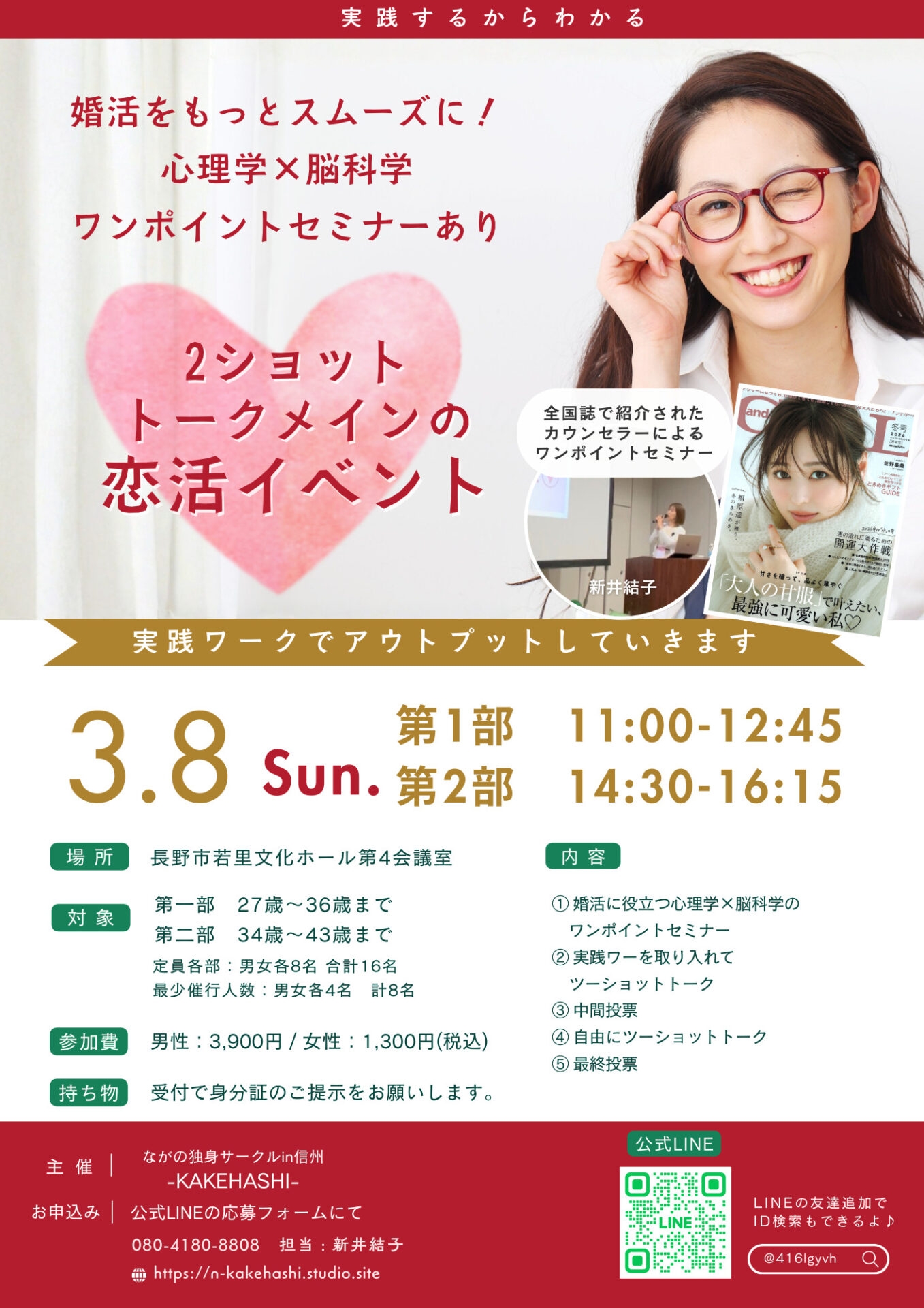 | 開催日時 | 2026年3月8日(日) 第1部 11:00〜12:45 第2部 14:30〜16:15 当日の流れ 2026年3月8日(日) 第1部 11:00〜12:45 対象:27〜36歳 10:30 受付開始 11:00 開始挨拶・自己紹介 11:10 ワンポイントセミナー 11:25 ワーク付き2ショットトーク 11:55 中間投票 12:05 2ショットトーク 12:35 最終投票 12:45 結果配布・終わりの挨拶 女性から解散 ーーーーーーーーーーーーーーー 第2部 14:30〜16:15 対象:34〜43歳 14:00 受付開始 14:30 開始挨拶・自己紹介 14:40 ワンポイントセミナー 14:55 ワーク付き2ショットトーク 15:25 中間投票 15:35 2ショットトーク 16:05 最終投票 16:15 結果配布・終わりの挨拶 女性から解散 |